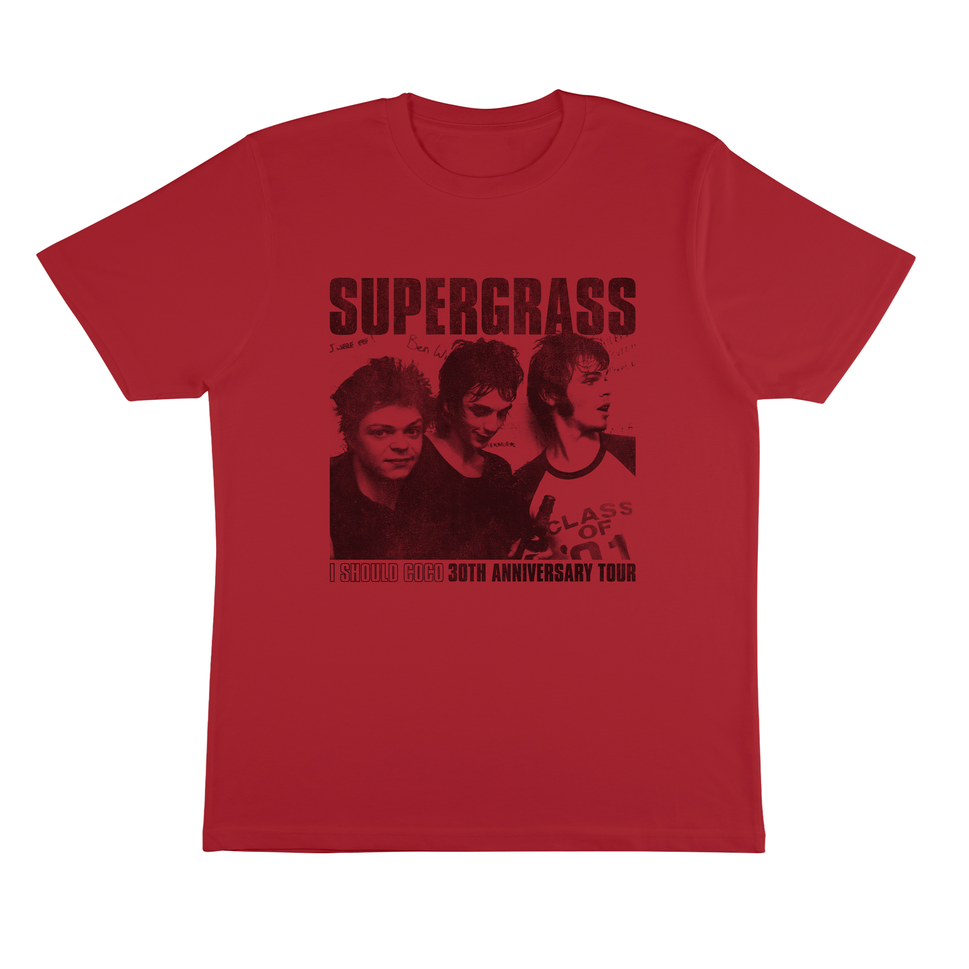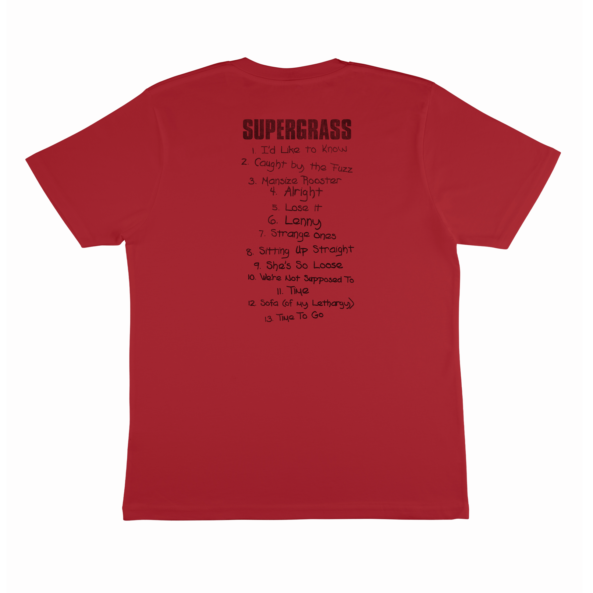 Unisex red tee with Supergrass photo on the front and I Should Coco tracklisting on the back.